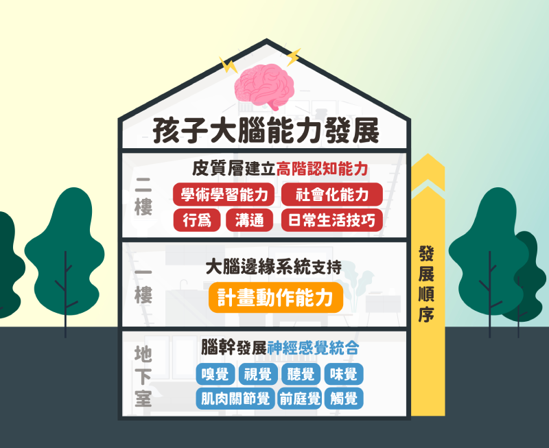 而爸媽關注的注意力不足、上課聽不聽得懂、人際互動、情緒、學習等問題,都是屬於高樓層能力,要建立良好的高階認知能力,最重要的是地下室是否有蓋好,包含大腦的嗅覺、視覺、肌肉關節覺、前庭覺...等感官系統是否有足夠刺激與發展。